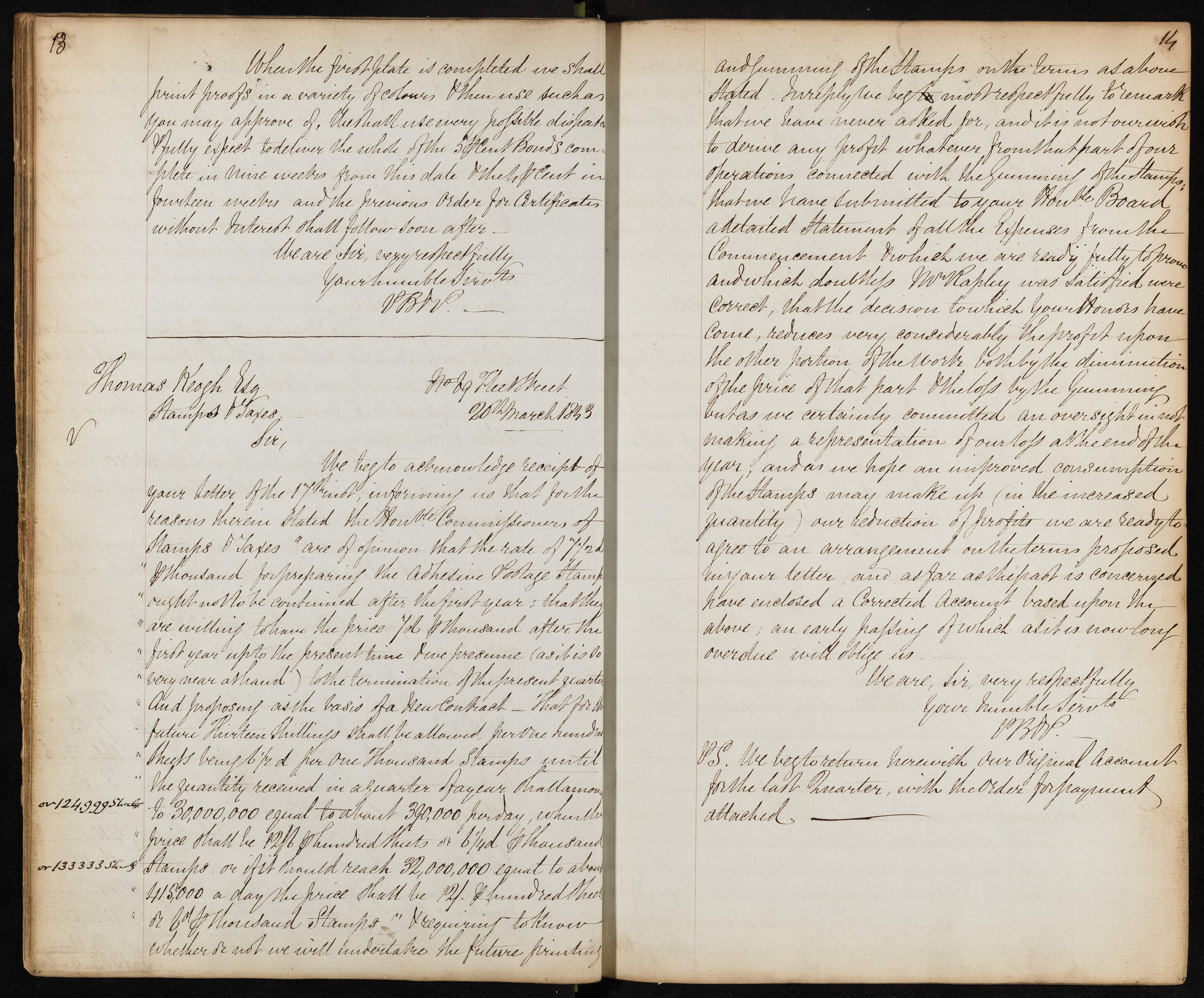 14 When the first setate, is completed we shall print proofs in a variety Bestours Othen use suchas of You may approve of. Meſhall use every possible dispate Pully expect to deliver the whole of the 5 flent Bond's com plere nine weetres from this date theliflent in fourteen weetes and the previous Order for Certificates without Interest shall follow soon after the are Air, very respectfully Hourkumble dérot VBMC Thomas Peach Esg Plamps & Taxes, и 4 " Six 26th March 1843 the beg to actmowledge receipt of Your botter, of the 17th not, informing us that for the reasons therein Slated the Honble Commissioners of Stamps d'Jaxes « are of opinion that the rate of 7½nd " 7/22 "thousand for preparing the Adhesive Portage Hamp "ought not to be contained after the first year; thattheng are withing to have the price Job #housand after the first year upto the present hime deve presume (asibiste very near athand) lothe termination Phe present gearti And proposing as the basis of a New Contract. That fürt Future Hirteen Shillings shall be allowed per tre hunden Chests being tips & per one thousand Stamps quitit The quantity recaved in a quarter Bayeur Mallamen or 124,999 Slender - to 30,000,000 equal to about 390,000 per day, while 1 price shall be 1978 Phundred Nuts or 6/4d thousand Hamps or if it thould reach 22,000,000 equal to abou 415,000 a day the price Shall be Pf. Jhundred ther or Get I thousand Stamps » Brequiring to know whether or not we will undertatre the future printing or 133333 Sh K " [ M And summing the Stamps on the terms as abous Stated. Erreply the best most respectfully lé remark that eve have never asked for, and it is not our wish ourwish to derive any profit whatever from that part of our operations connected with the Zumming Whe Stamps- that we have submitted to your Bouble Board adetailed Statement of all the Expenses from the Commencement Prwhich we are by jeetly to prove and which doubtless McRapley. was satisfied were Correct, that the decision towhich Your Honors have Come, reduces very considerably the profit upon the other portion Of the works, both by the dinninuction of the price of that part Othelost by the Gemming butas we certainly committed an oversight innot making a representation of our toss attheendofthe ourtoss year, and as we hope improved consumption By the Flamps may make up (in the iner increased quantity) our Reduction of profits we are ready to arrangement on the terus proposed, mirjour letter, and as far as the past is concerized have cuclosed a Corrected account based upon the above, an early passing of which at it is now long 88. afree to overdue will. us the are, sir, very respectfully Your Rumble Servté PRAP PS. We begto return herewith, our Riginal Account, for the last Quarter, with the Order for payment attached