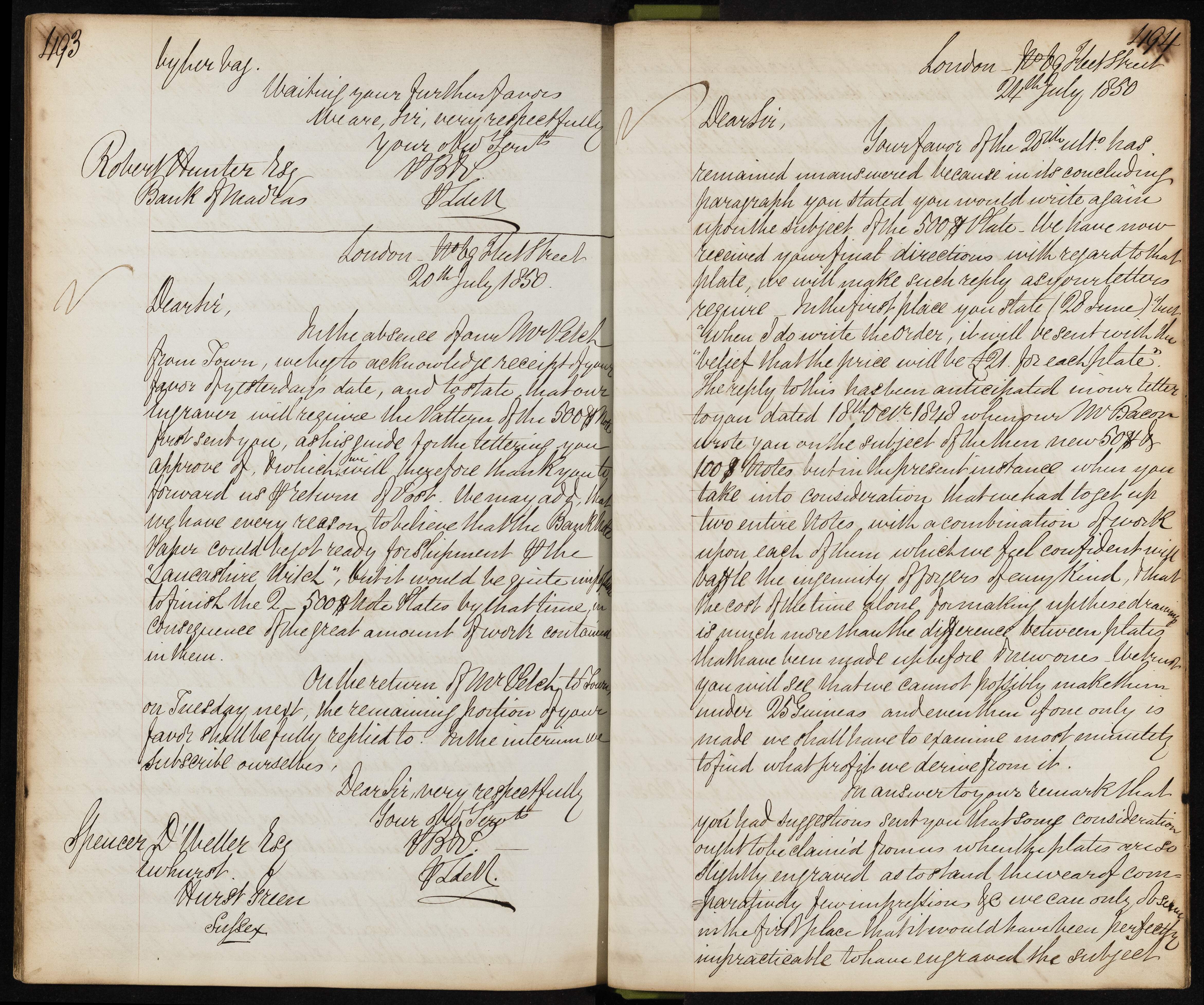 Summary: Robert Hunter acknowledges receipt of a favor and discusses engraving requirements for banknotes, mentioning the 'Lancashire Witch' and the need to finish notes by a certain time.