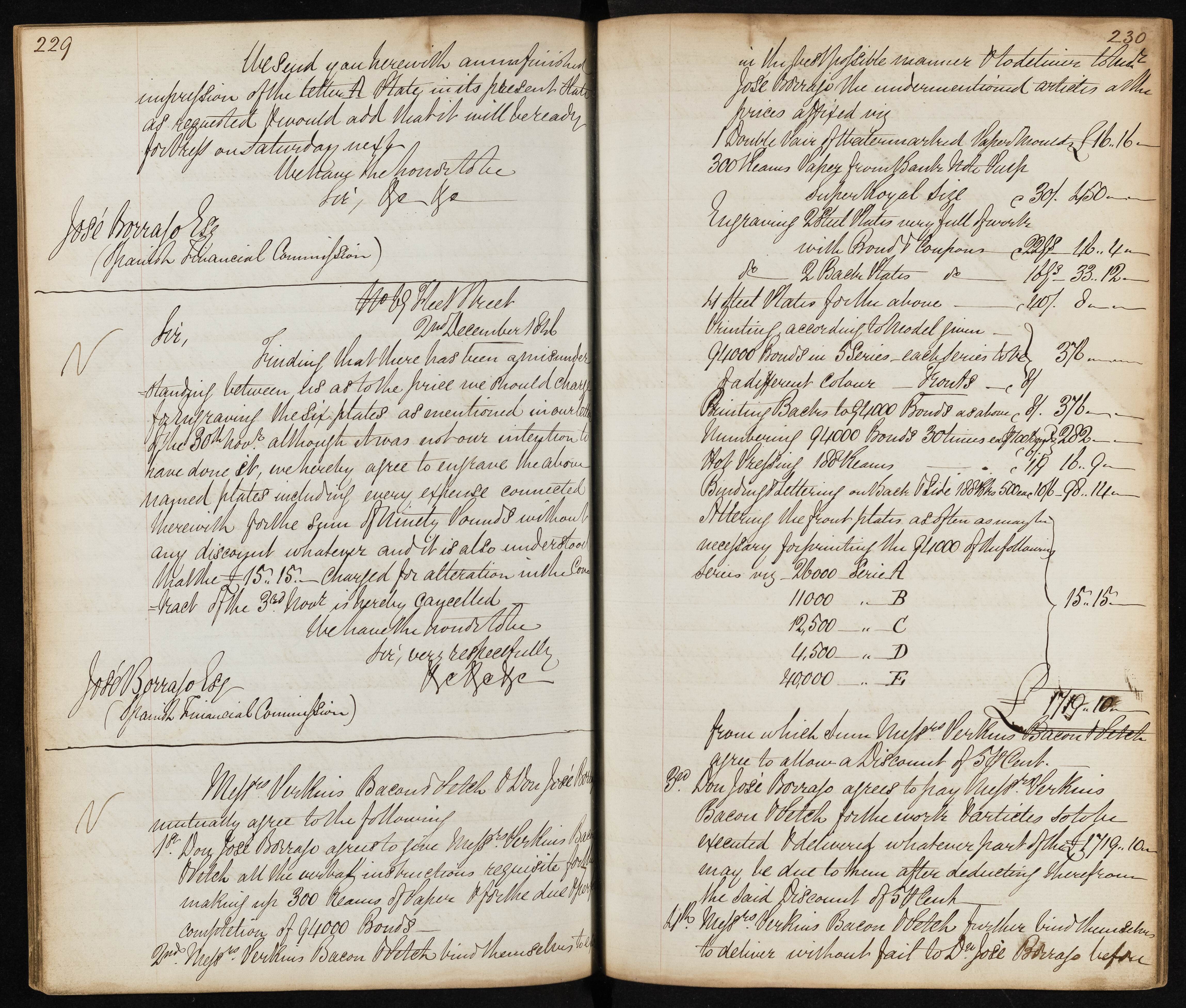 Summary: This letter discusses the agreement to engrave six plates and produce 300 reams of paper for bonds, including pricing and delivery terms. It also mentions the cancellation of a charge and the commitment to deliver materials without fail.