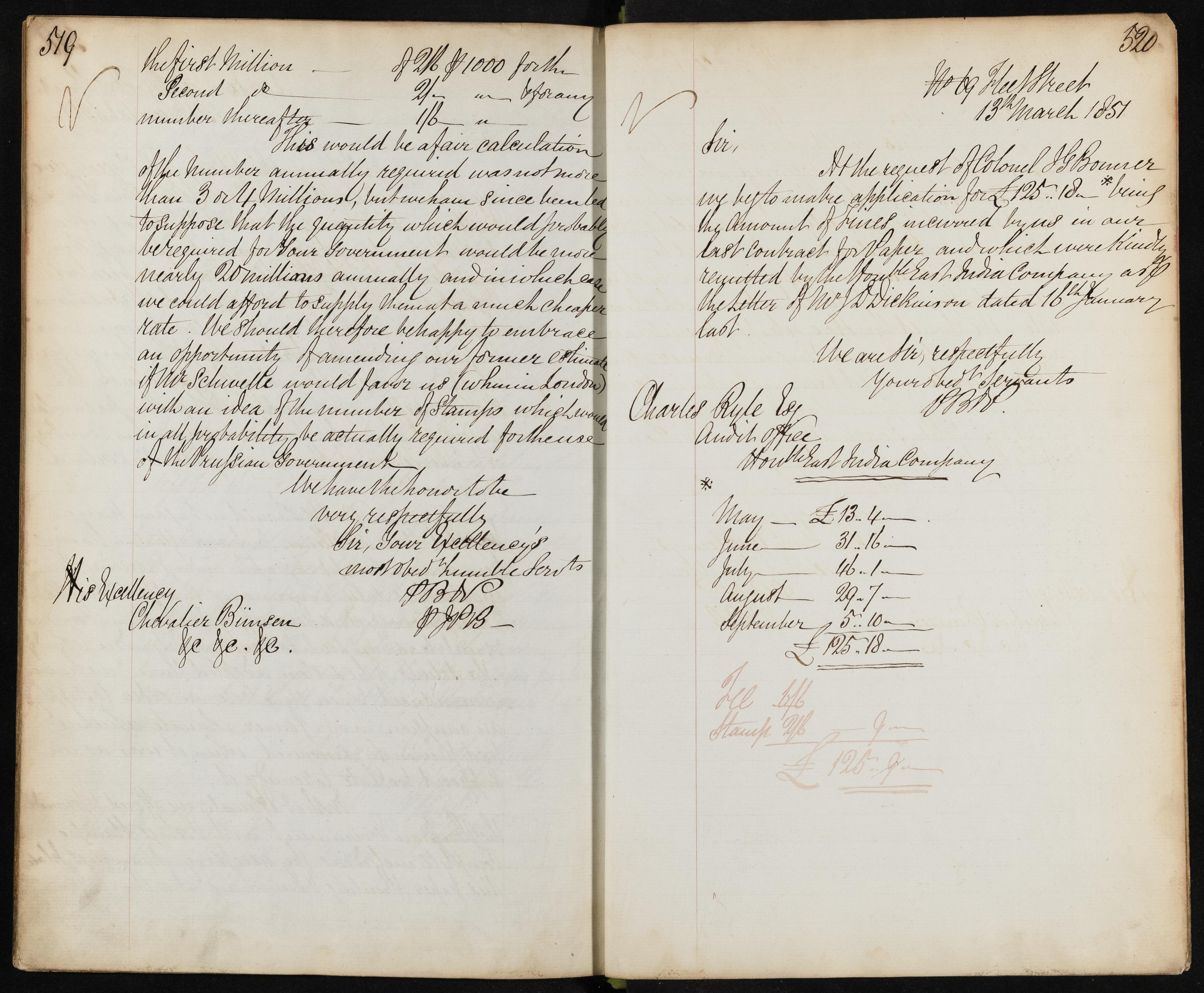 Summary: Charles Ryle writes to Colonel BG Bonner regarding an application for £195-1d related to fines memorized in the last paper contract. He discusses the annual quantity of stamps required by the government, estimating nearly 20 million annually, and offers to supply them at a cheaper rate.