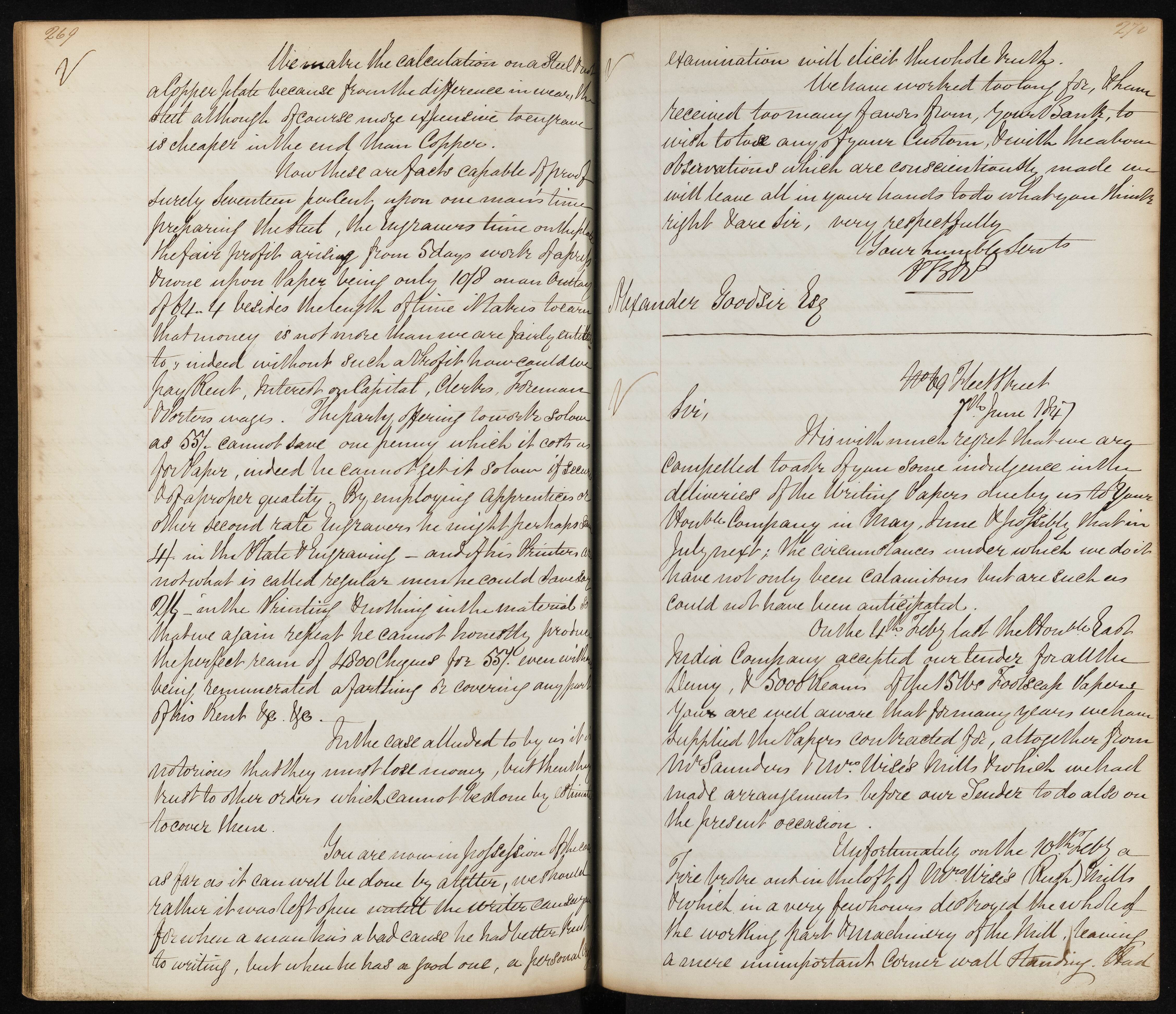 Summary: The letter explains the delay in deliveries of writing papers due to unforeseen calamitous circumstances, including a fire at a mill. The sender requests indulgence for the delays in May, June, and possibly July.