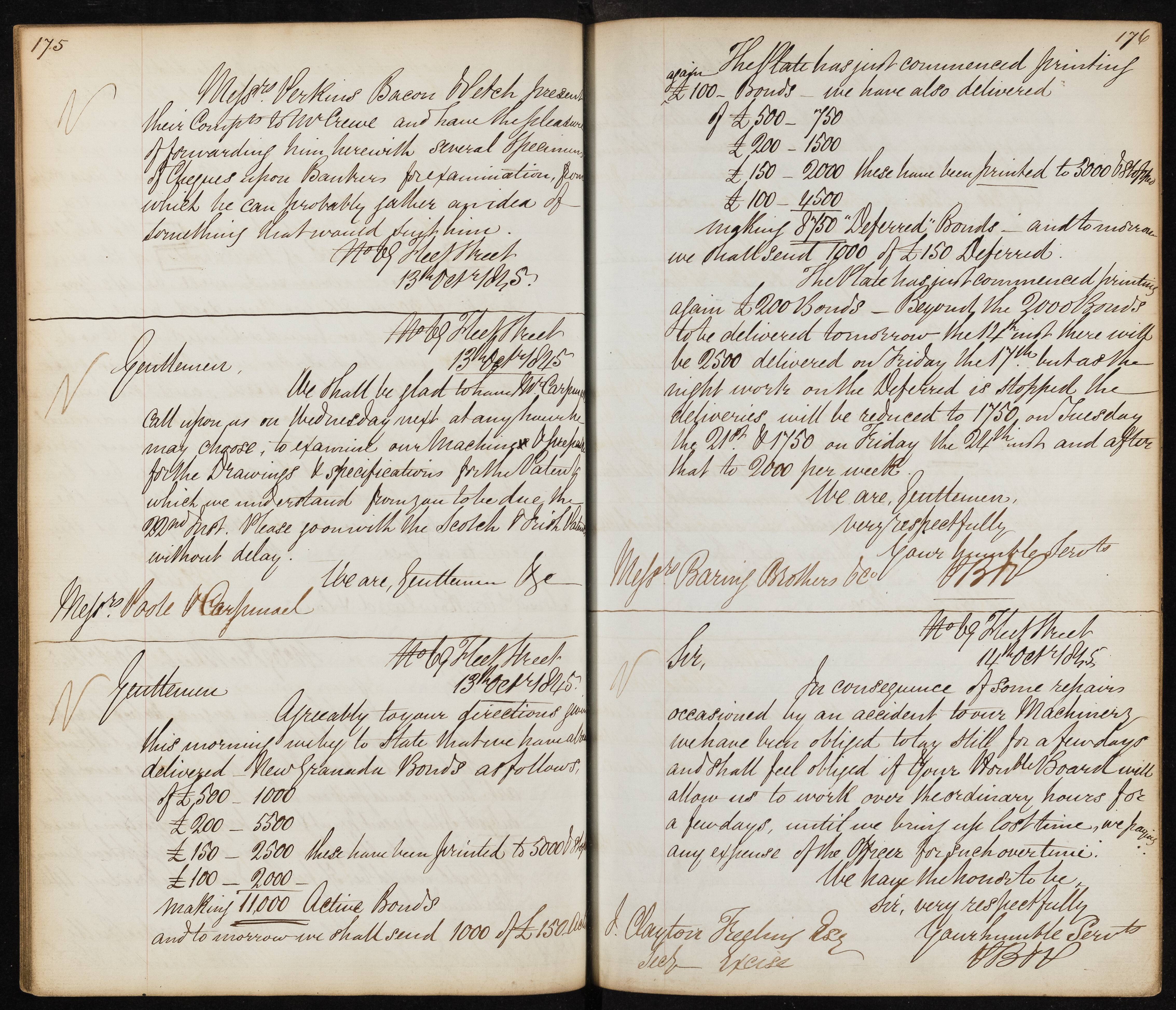 Summary: The sender informs the recipients about the delivery and printing status of New Granada Bonds in various denominations, including active and deferred bonds, with quantities and printing progress detailed.