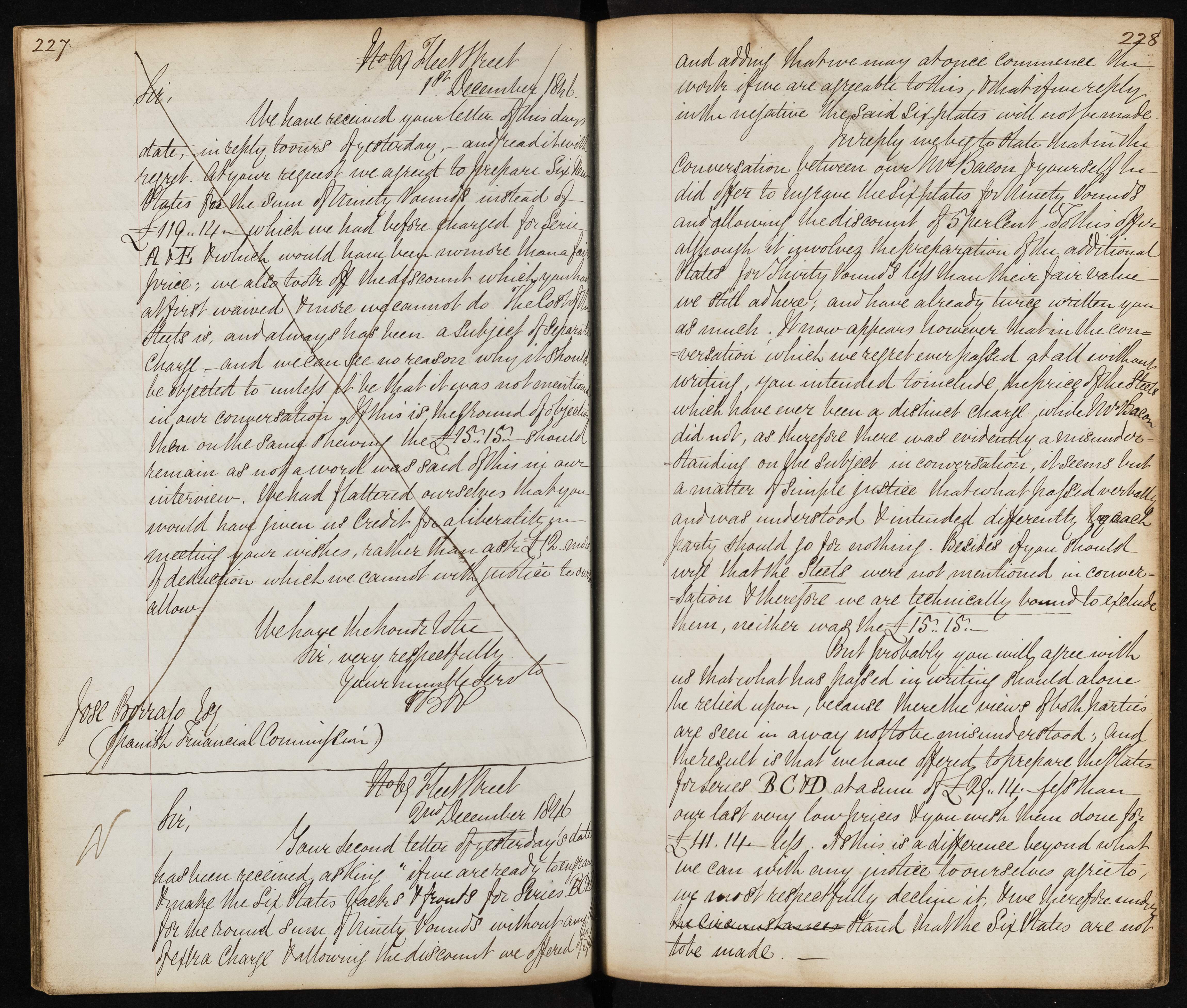 Summary: The letter discusses the preparation and pricing of Six States plates, addressing a discount and a disputed charge of £15-15-. The sender expresses regret over misunderstandings and declines to agree to a price difference beyond their offer.