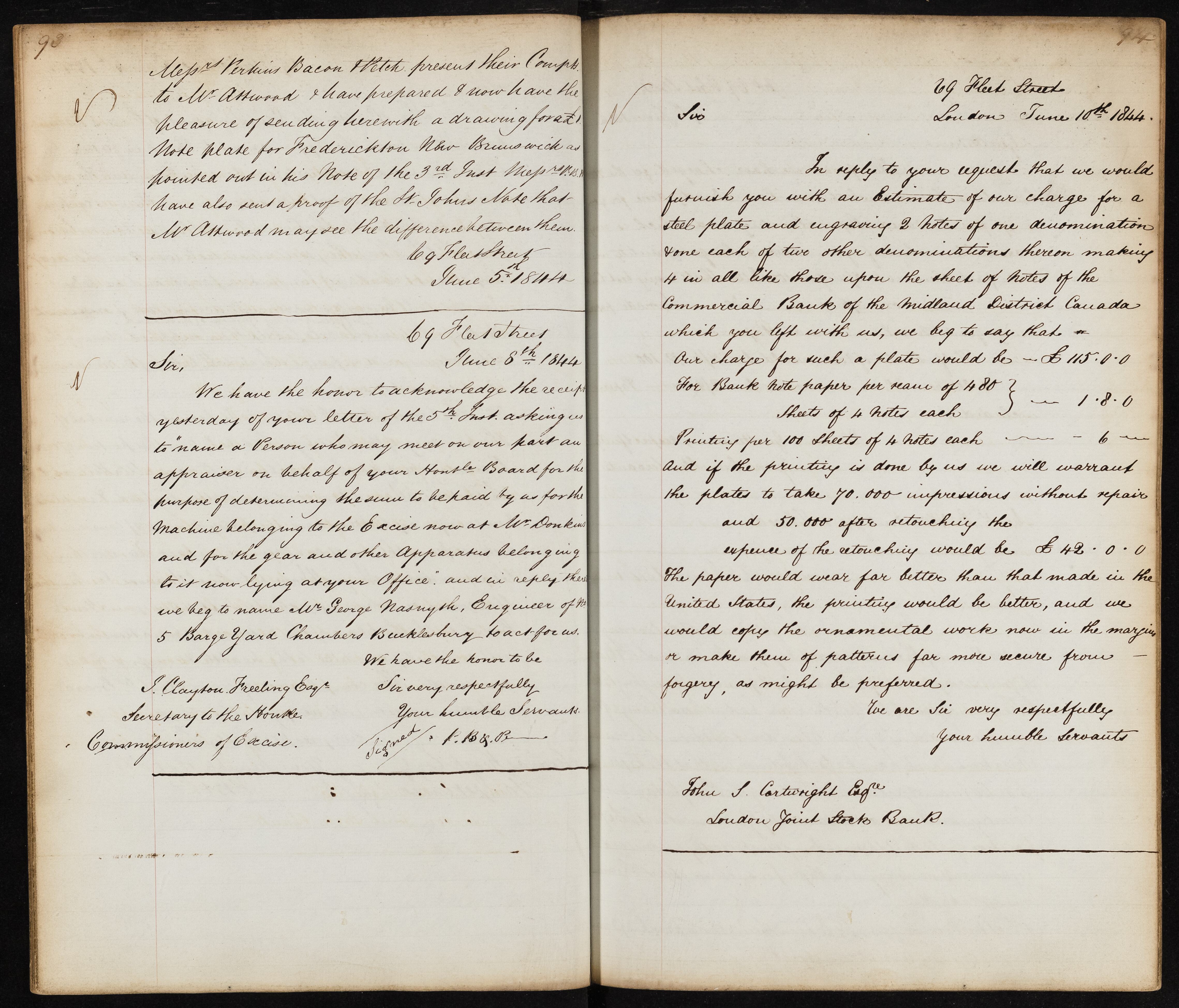 Summary: Messrs Perkins Bacon Mitch send a drawing for a note plate for Frederickton, New Brunswick, as requested by Mr Attwood. They also provide a proof of the St. Johns Note for comparison.