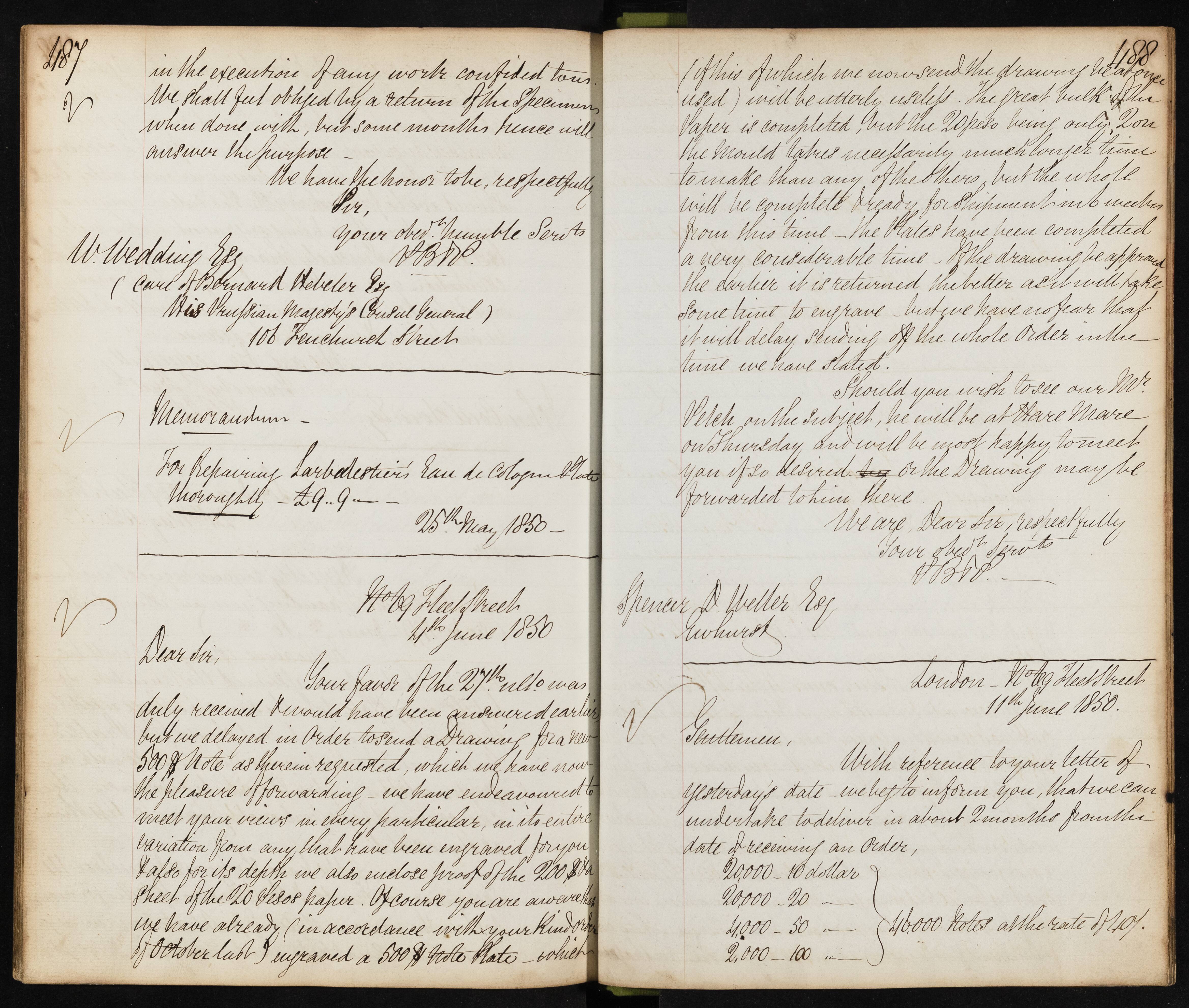Summary: The sender acknowledges receipt of a letter dated 27th and forwards a drawing for a new 500 & Note, explaining the engraving process and expected shipment timeline.