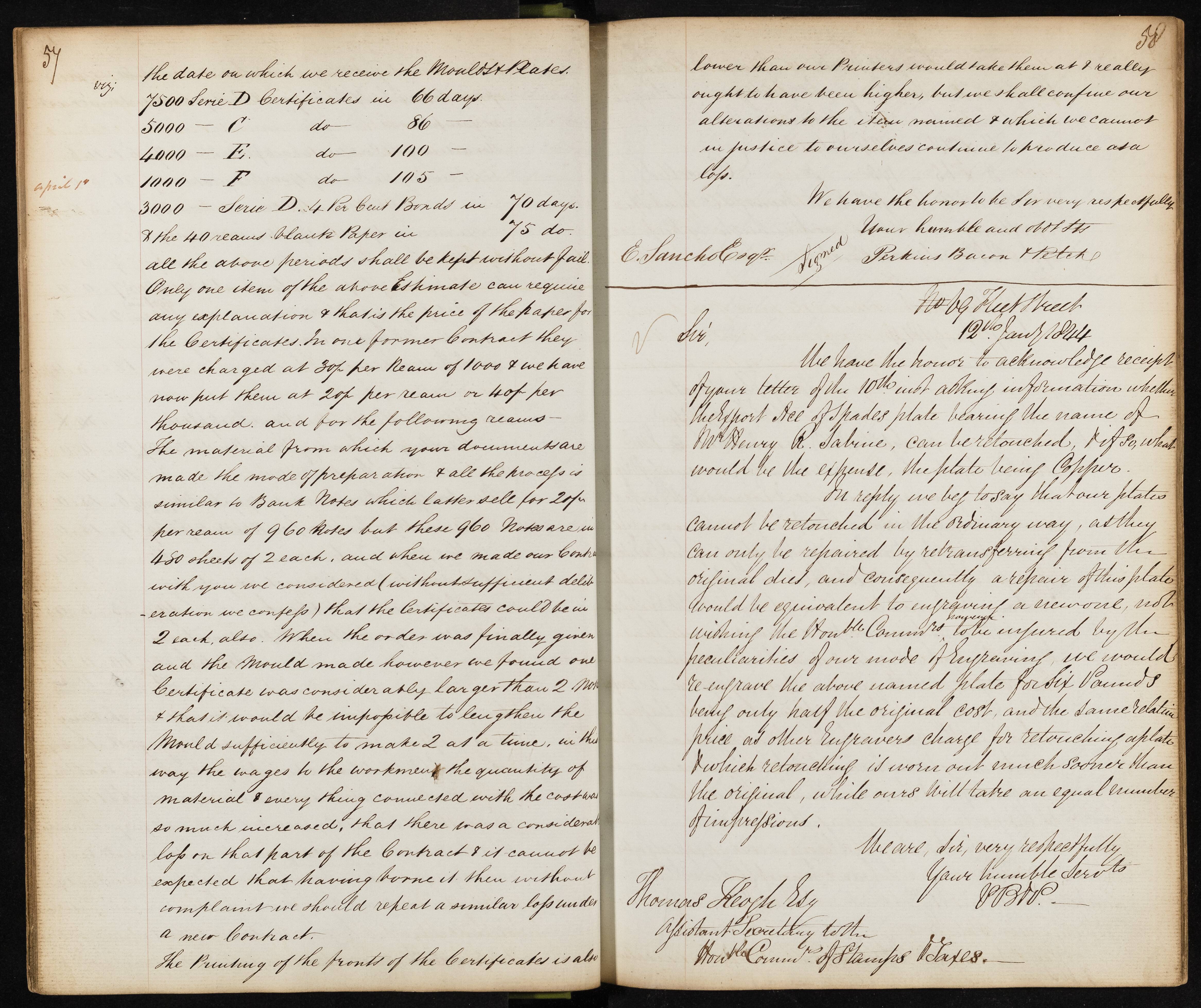 Summary: The letter discusses the pricing and production details of Moulist Plates and Serie D Certificates, including paper costs, printing, and contract terms. It explains the challenges in manufacturing and justifies the pricing adjustments.