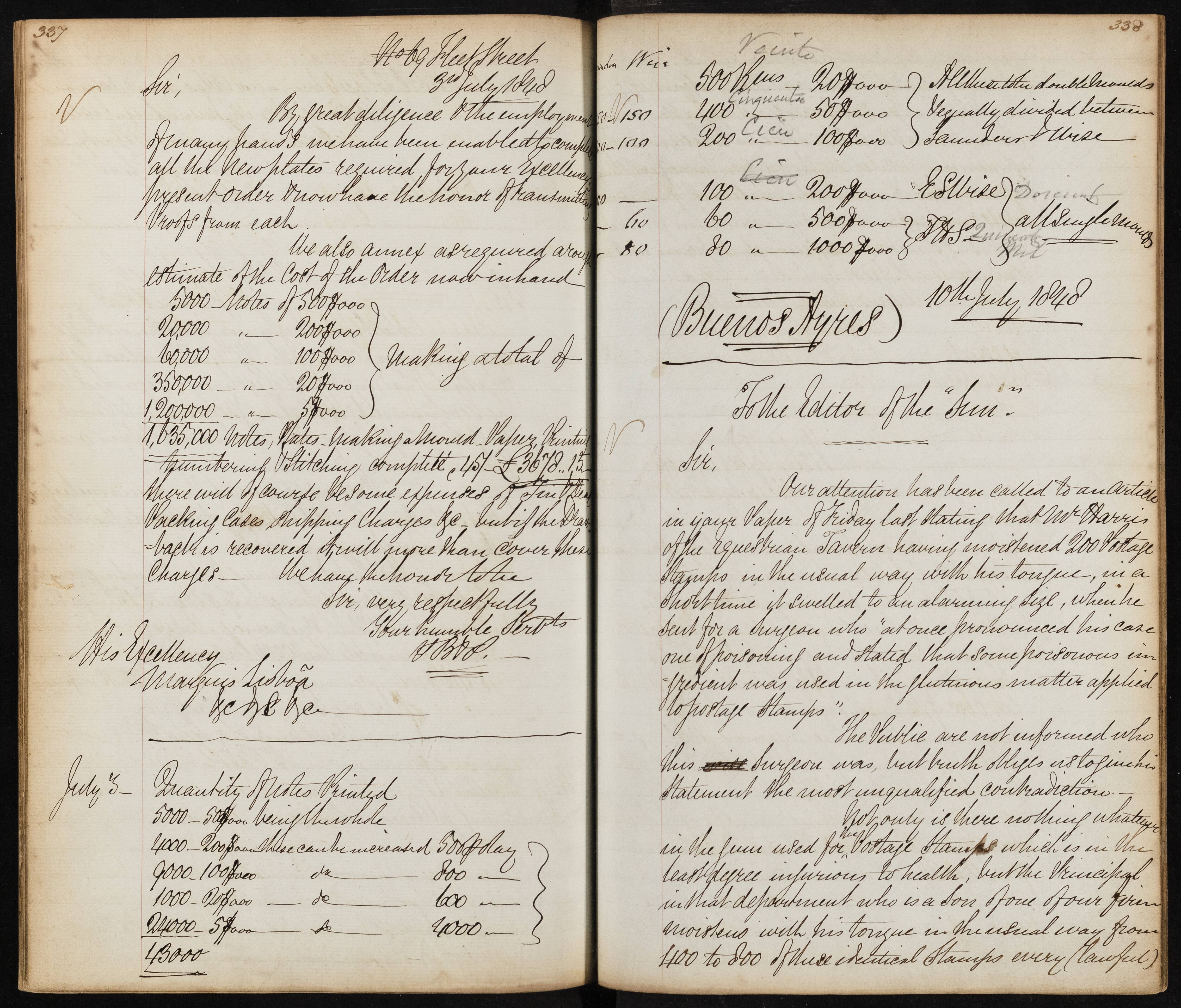 Summary: The letter discusses estimates and orders for plates and materials, mentioning quantities and costs. It includes references to employees' diligence and various production details.