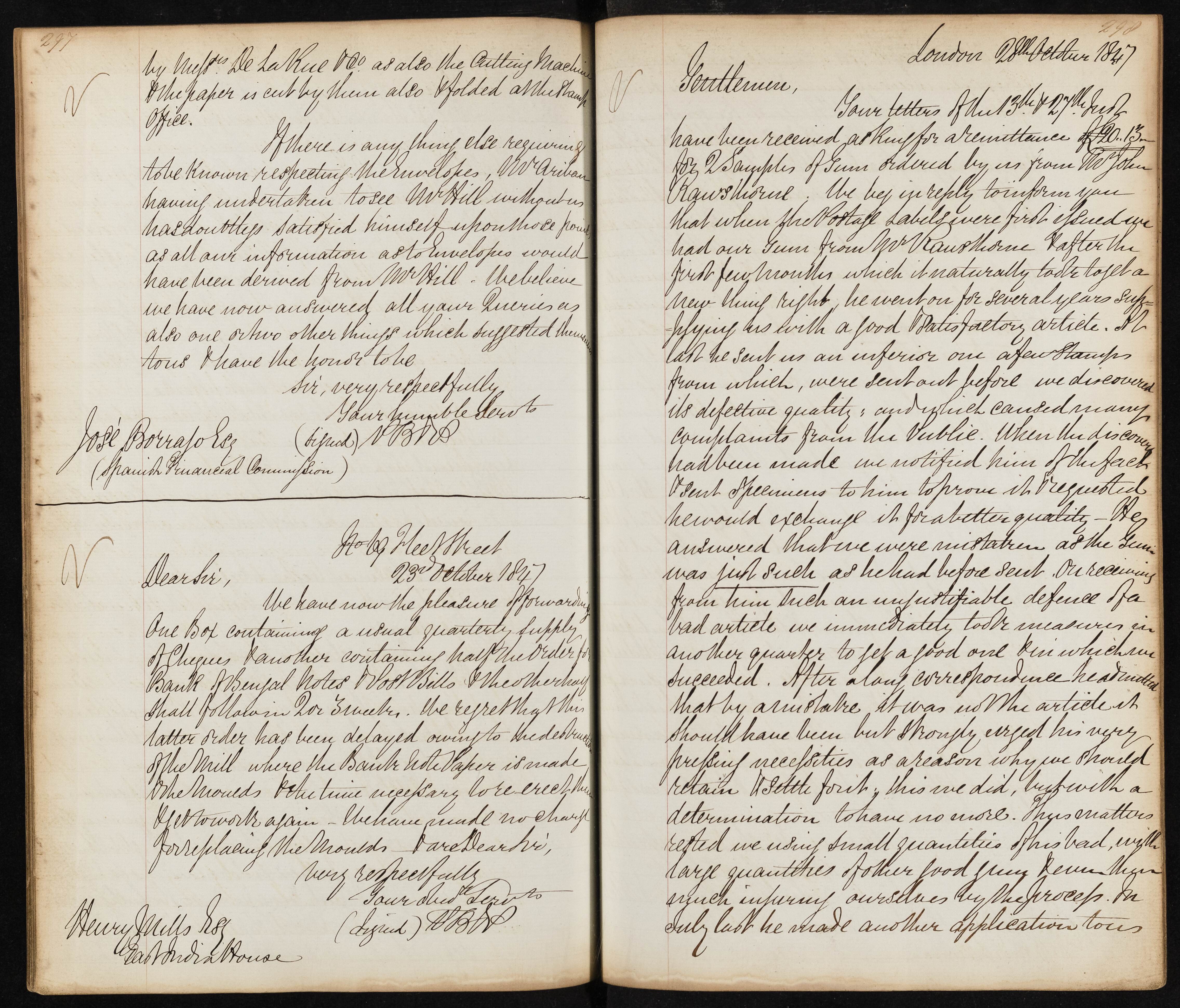 Summary: Henry Mill forwards a box containing a quarterly supply of cheques, orders, and Bengal notes, apologizing for delays due to destruction of the mill producing bank letter paper.