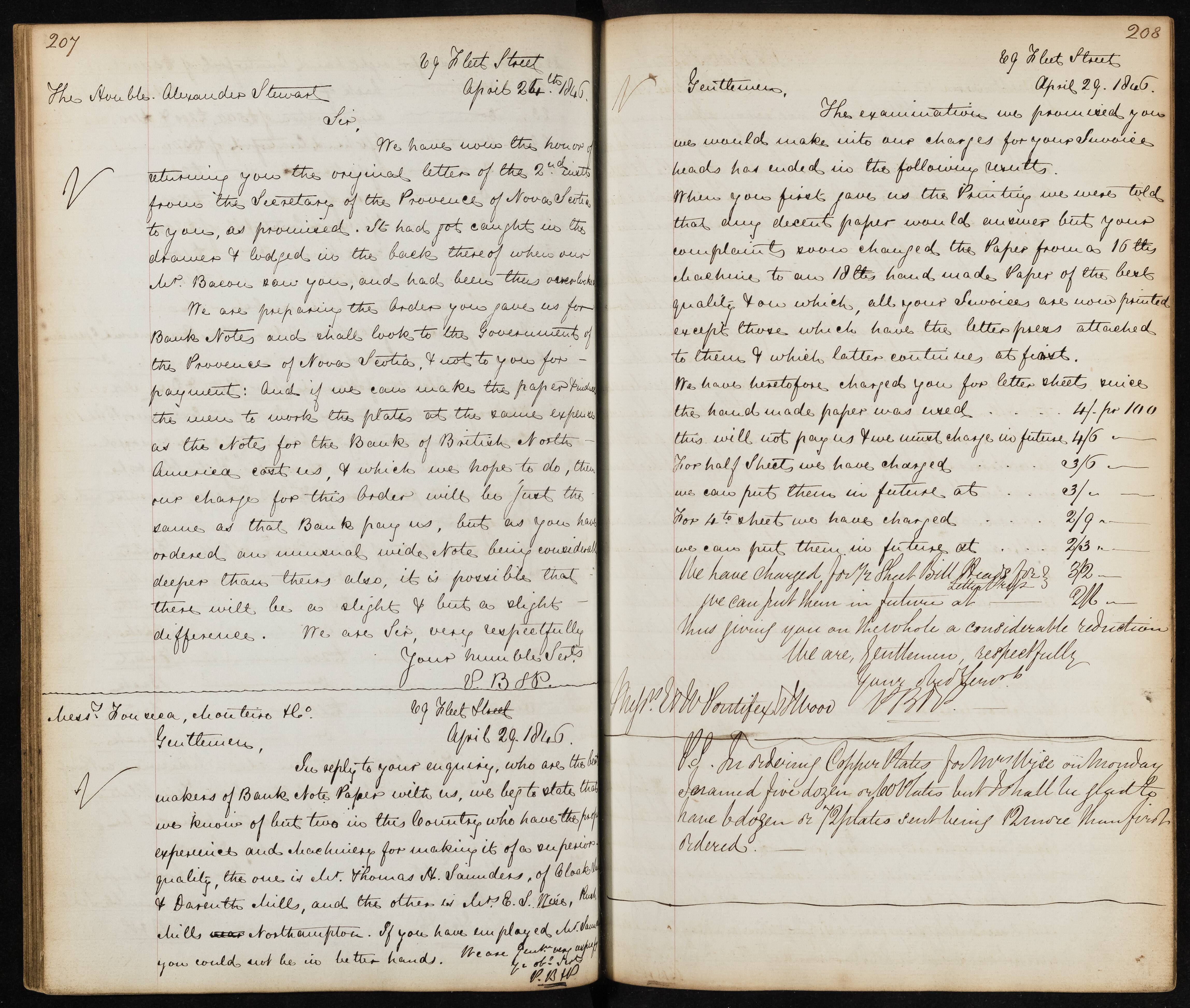 Summary: The sender informs about the original letter from the Secretary of the Province of Nova Scotia and discusses preparations for bank notes and paper quality. They mention hopes to match the paper price and details about the bank note plates.