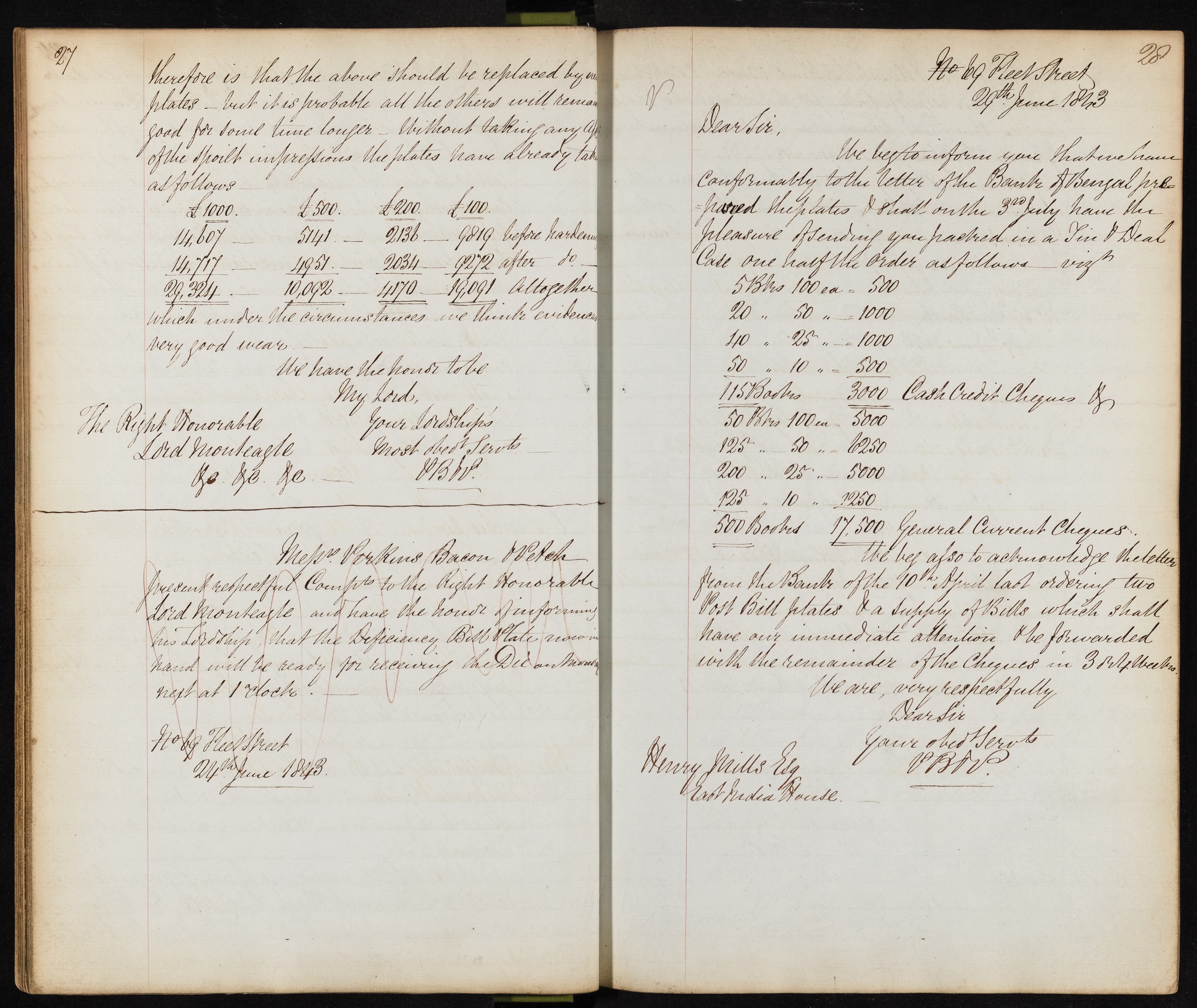 Summary: Henry Skills Elg informs the recipient about the preparation and delivery of plates and cheques, including details of the order and acknowledgment of a letter from the Banks dated 10th April.