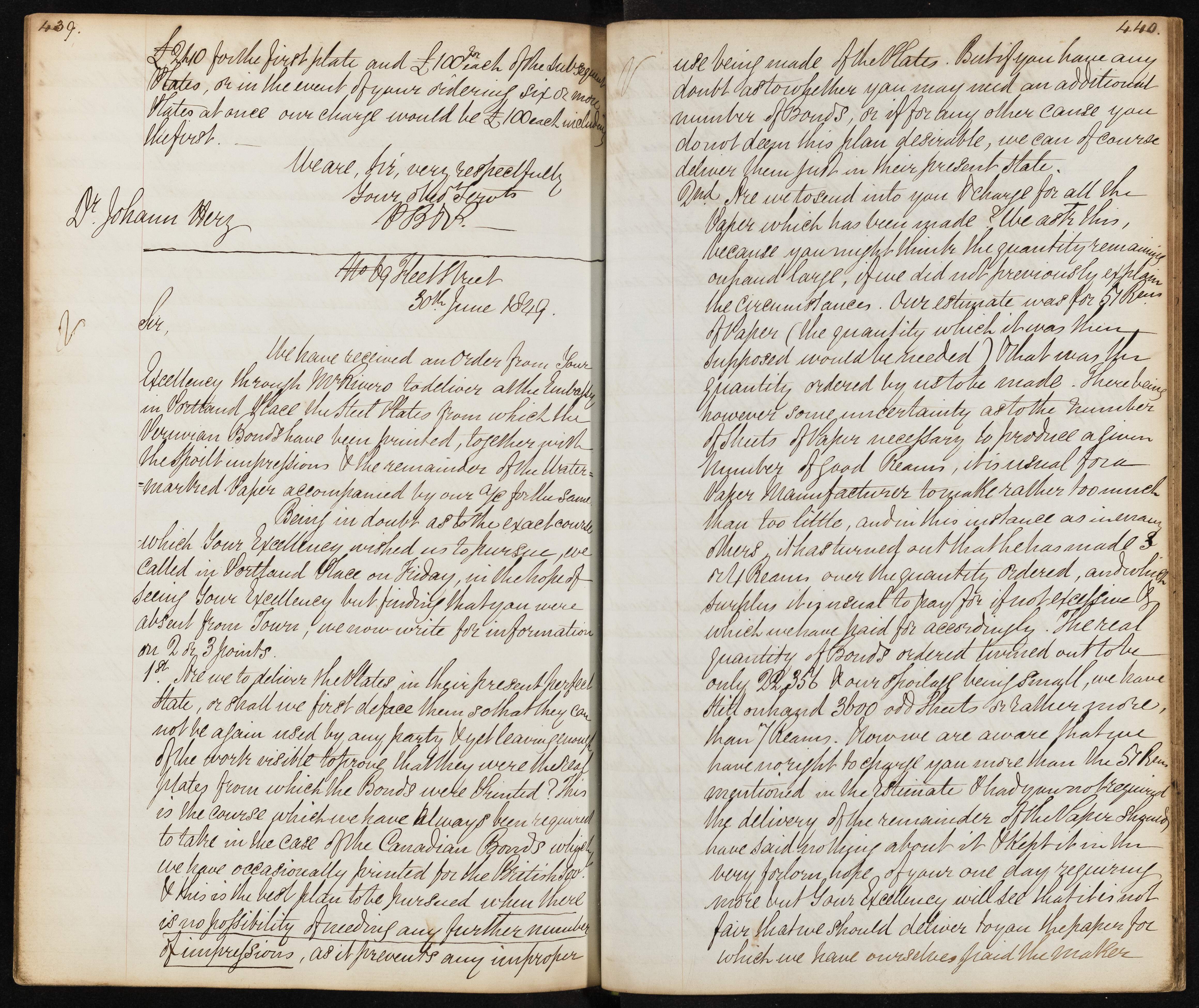 Summary: The letter discusses the receipt of an order for plates and paper related to Vezuvian Bonds, queries instructions on handling the plates, and addresses concerns about charges for surplus paper.
