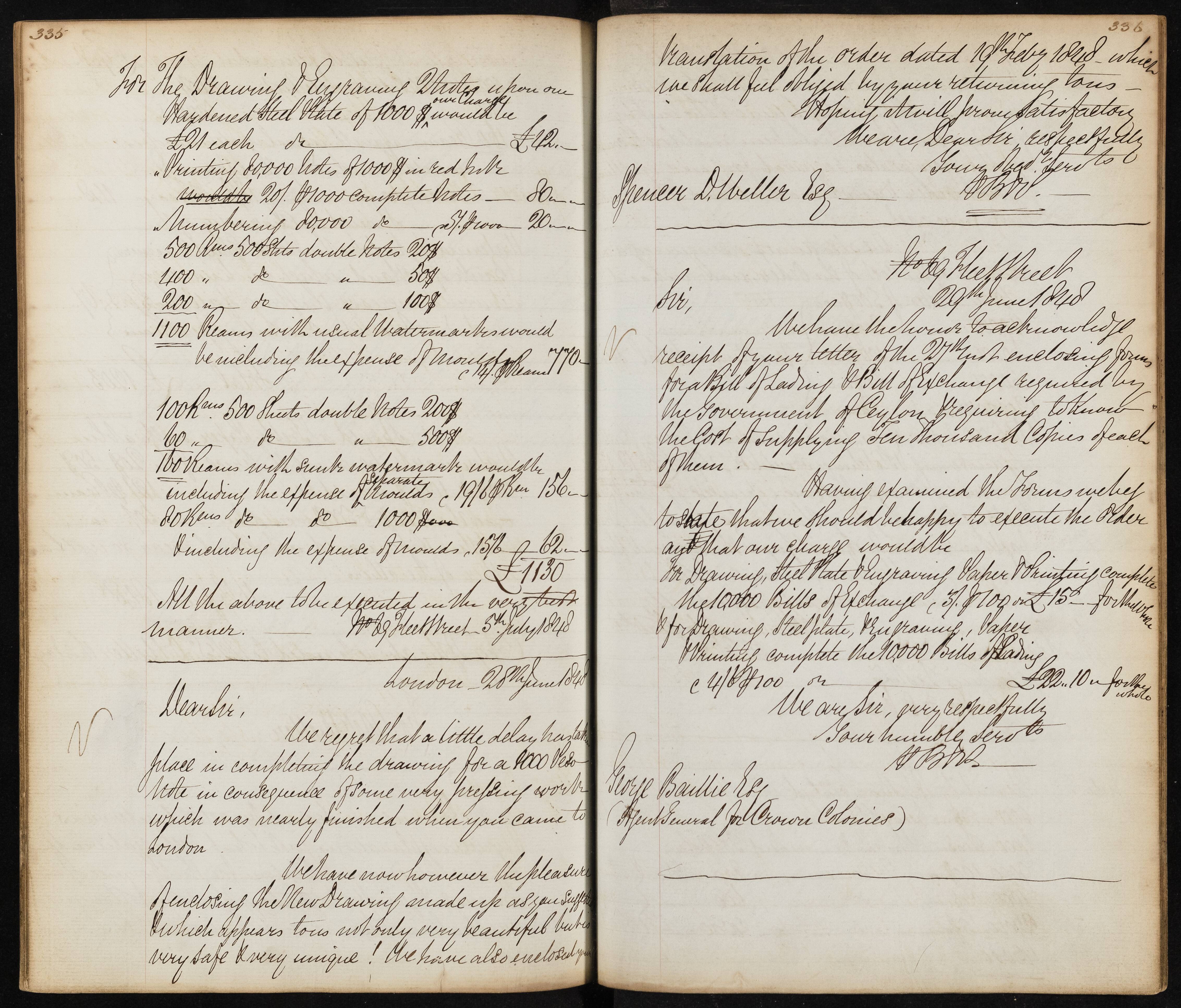 Summary: The letter discusses the order dated 10th and the completion of drawings for 1000 notes, including details about printing, numbering, watermarking, and costs. It mentions a delay in completing the drawing and the pleasure in endorsing the new drawing which is described as beautiful and safe.