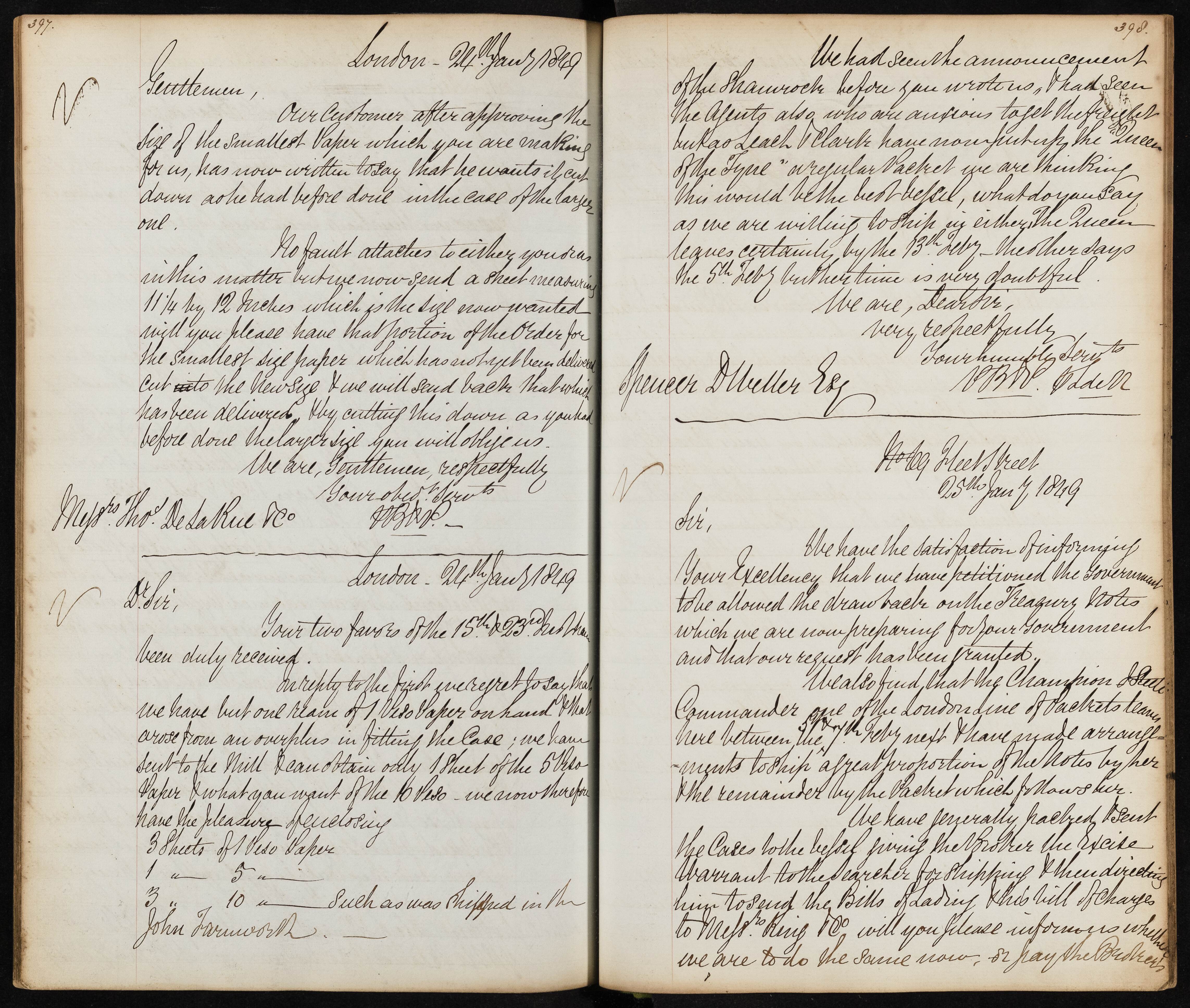 Summary: Information is given about petitioning the government to allow drawback on Treasury Notes being prepared for shipment. Arrangements have been made with the London Line of Packets for shipping and handling of the notes.