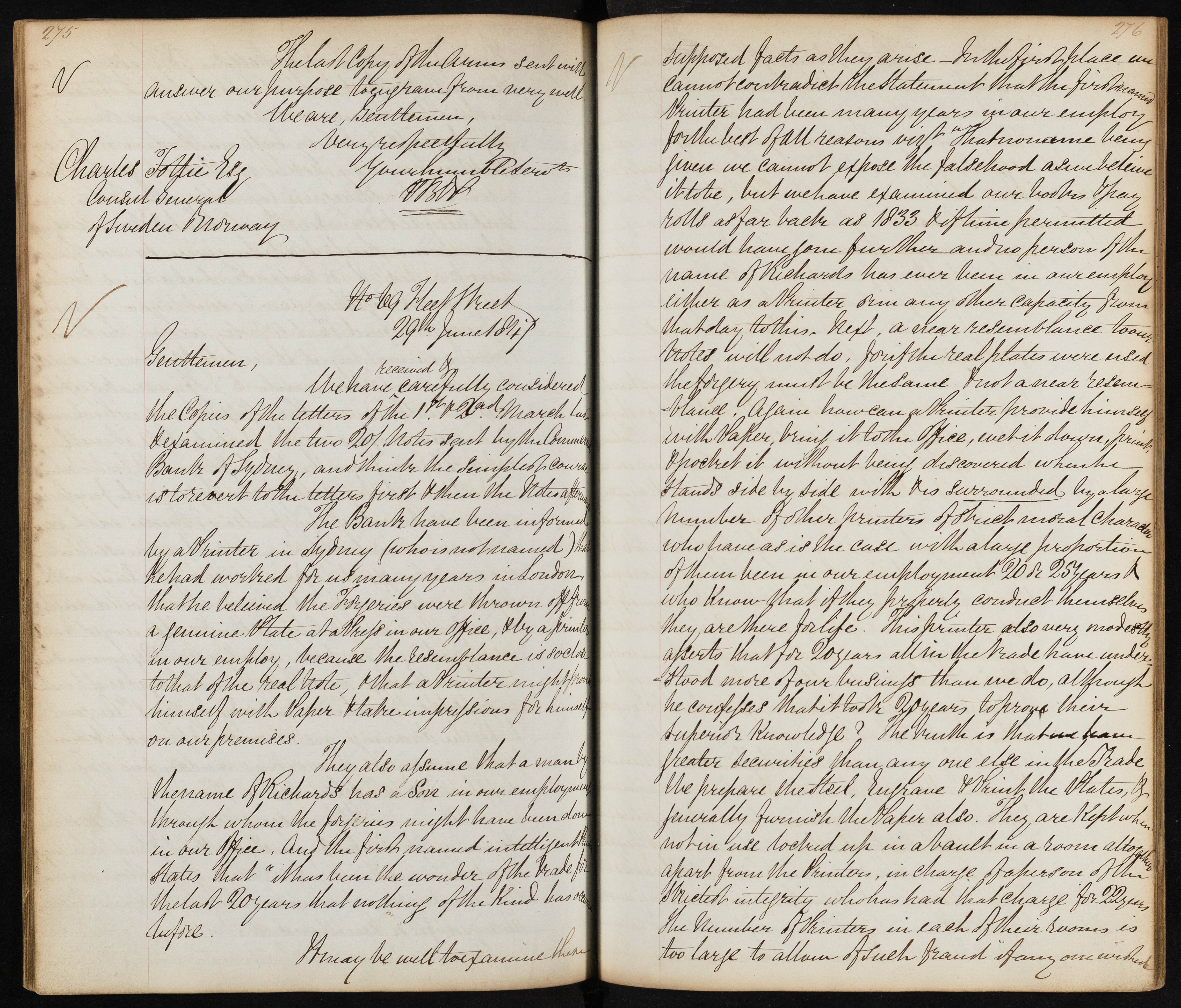 Summary: The letter discusses the examination of forged letters and notes related to the trade, mentioning suspicions about forgery originating from a printing plate in their office and addressing the integrity of their printers and employees.