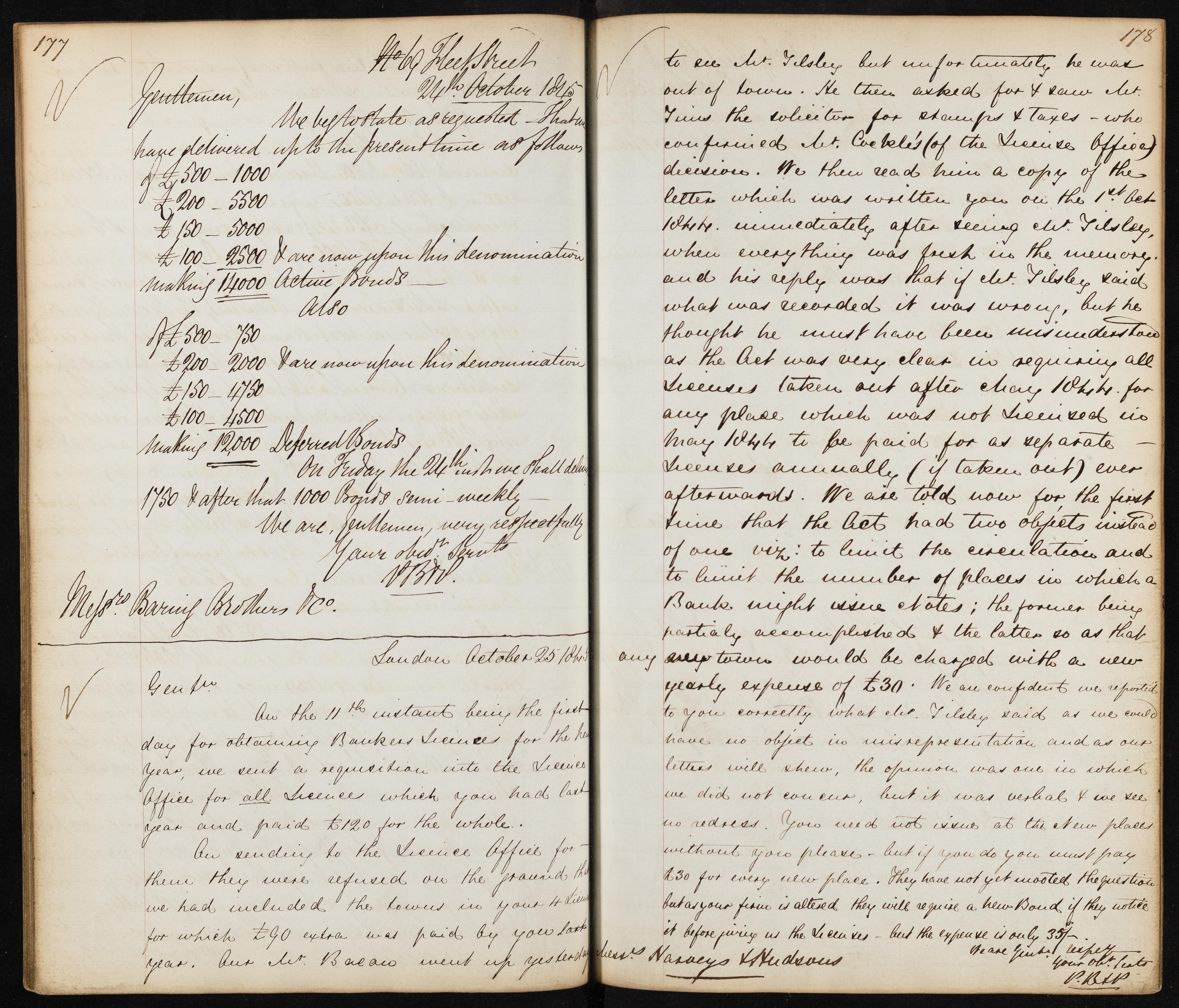 Summary: The letter reports on the delivery and status of active and deferred bonds, mentions upcoming payments, and discusses issues related to obtaining Bankers Licences and associated fees.