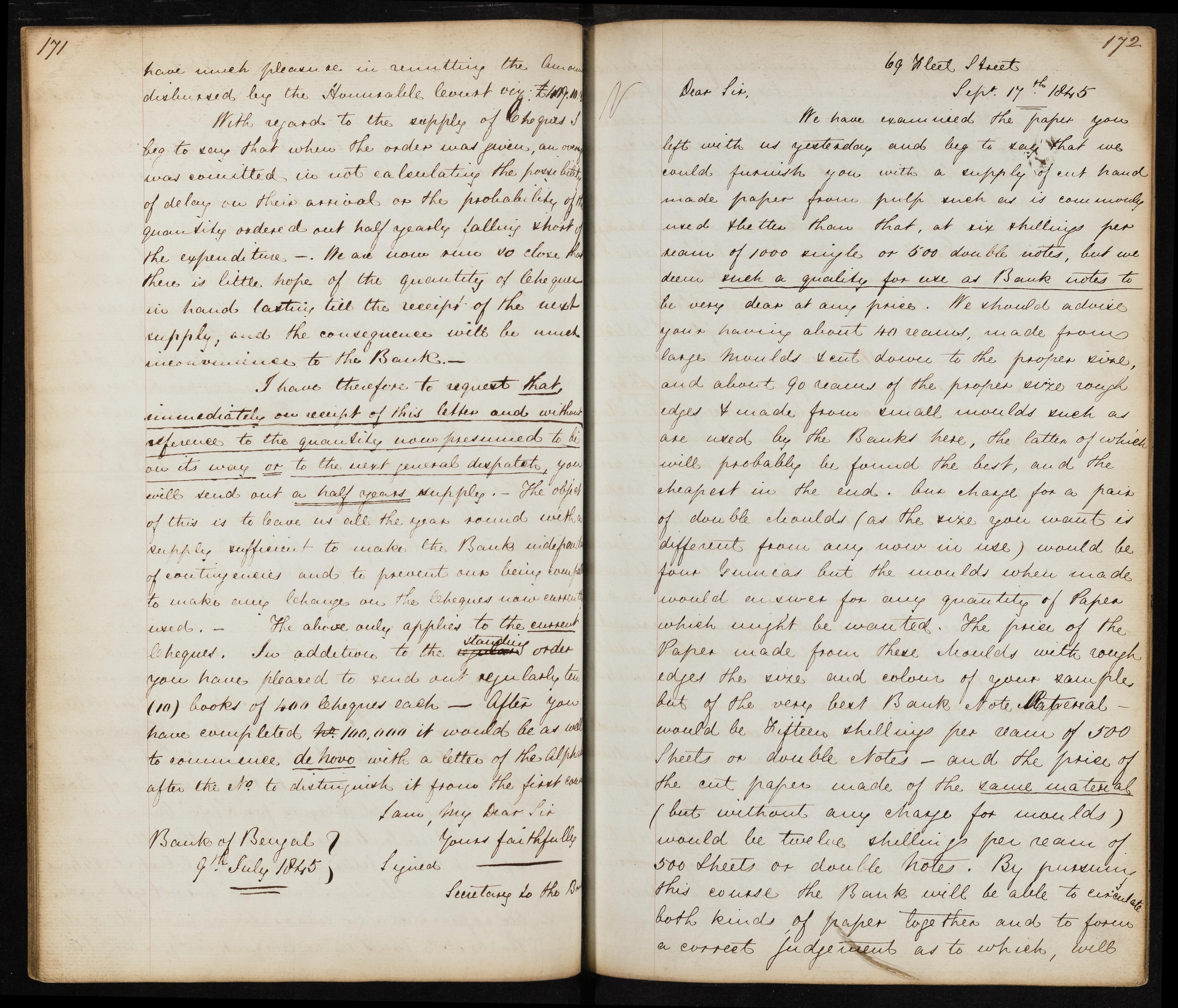 Summary: The letter discusses issues with the supply of cheques, requesting immediate dispatch of a half year's supply to avoid inconvenience to the Bank. It also mentions sending ten books of 400 cheques each and instructions for distinguishing new cheque books.