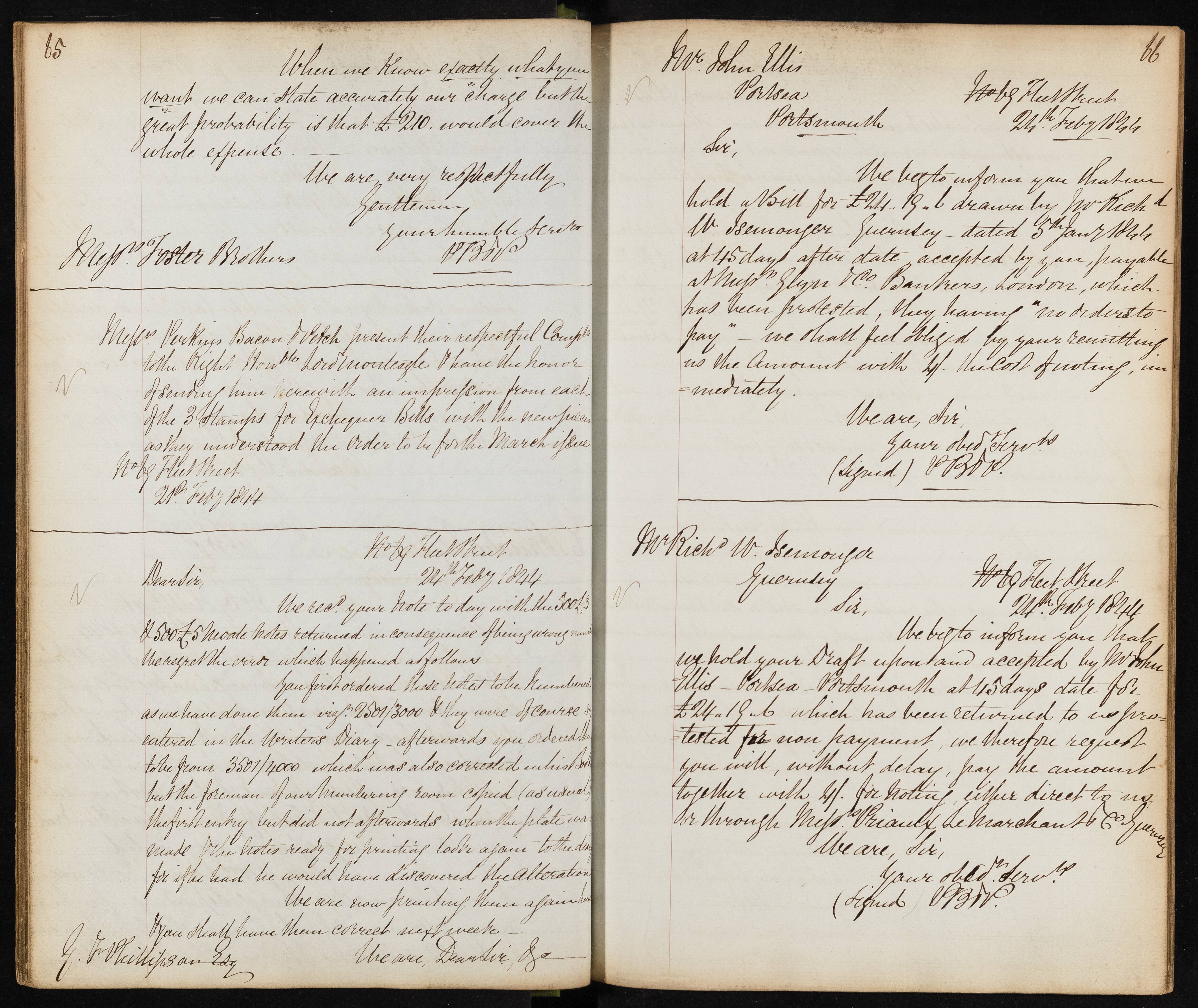 Summary: Notification about a protested draft drawn by W. Isemonger of Guernsey, requesting payment with additional charges for noting.