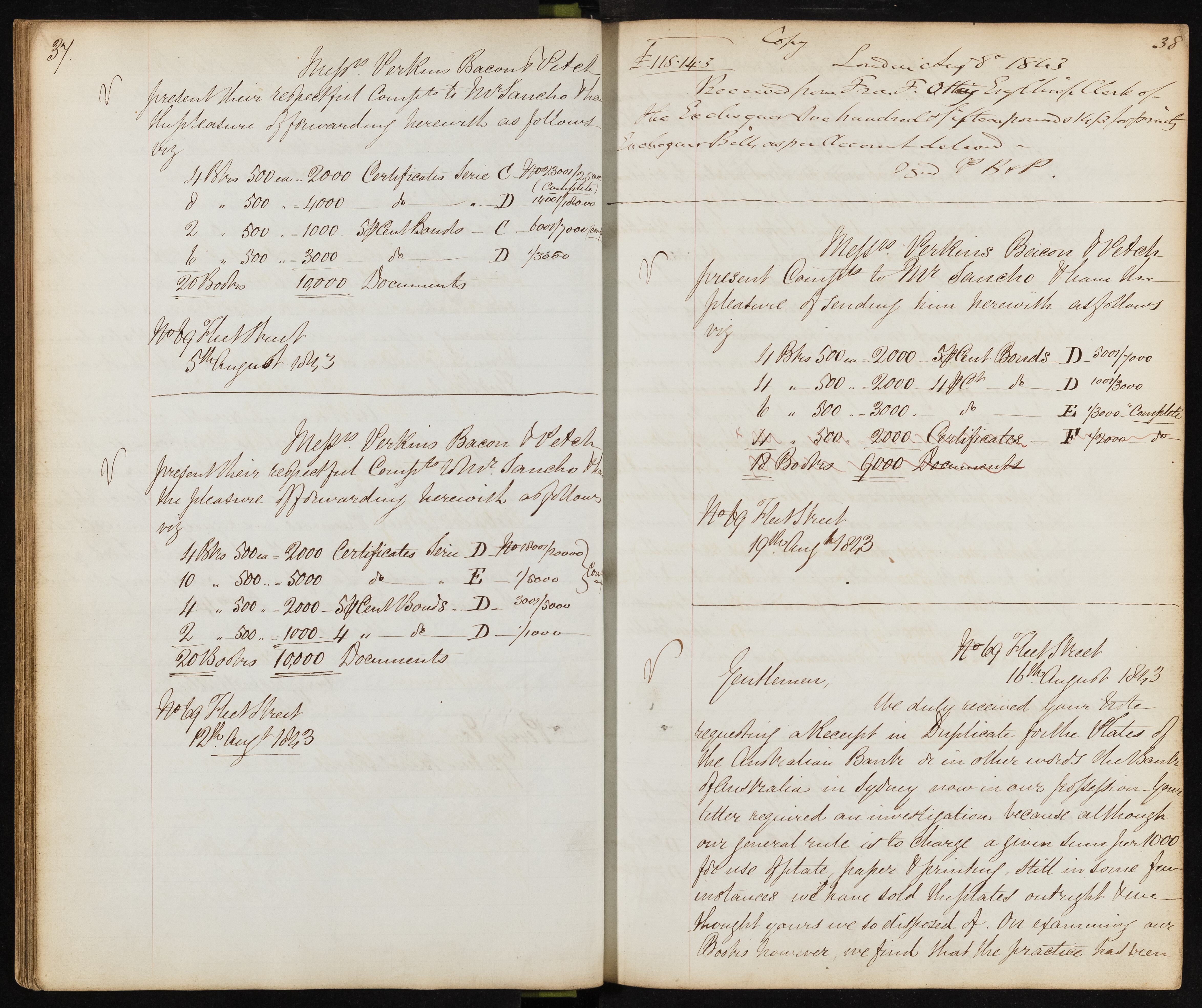 Summary: Mess Perkins Bacon & Vetch present their respectful compte to Mr. Sancho, forwarding details of Enchequer bills, certificates, and splent bonds as per account.