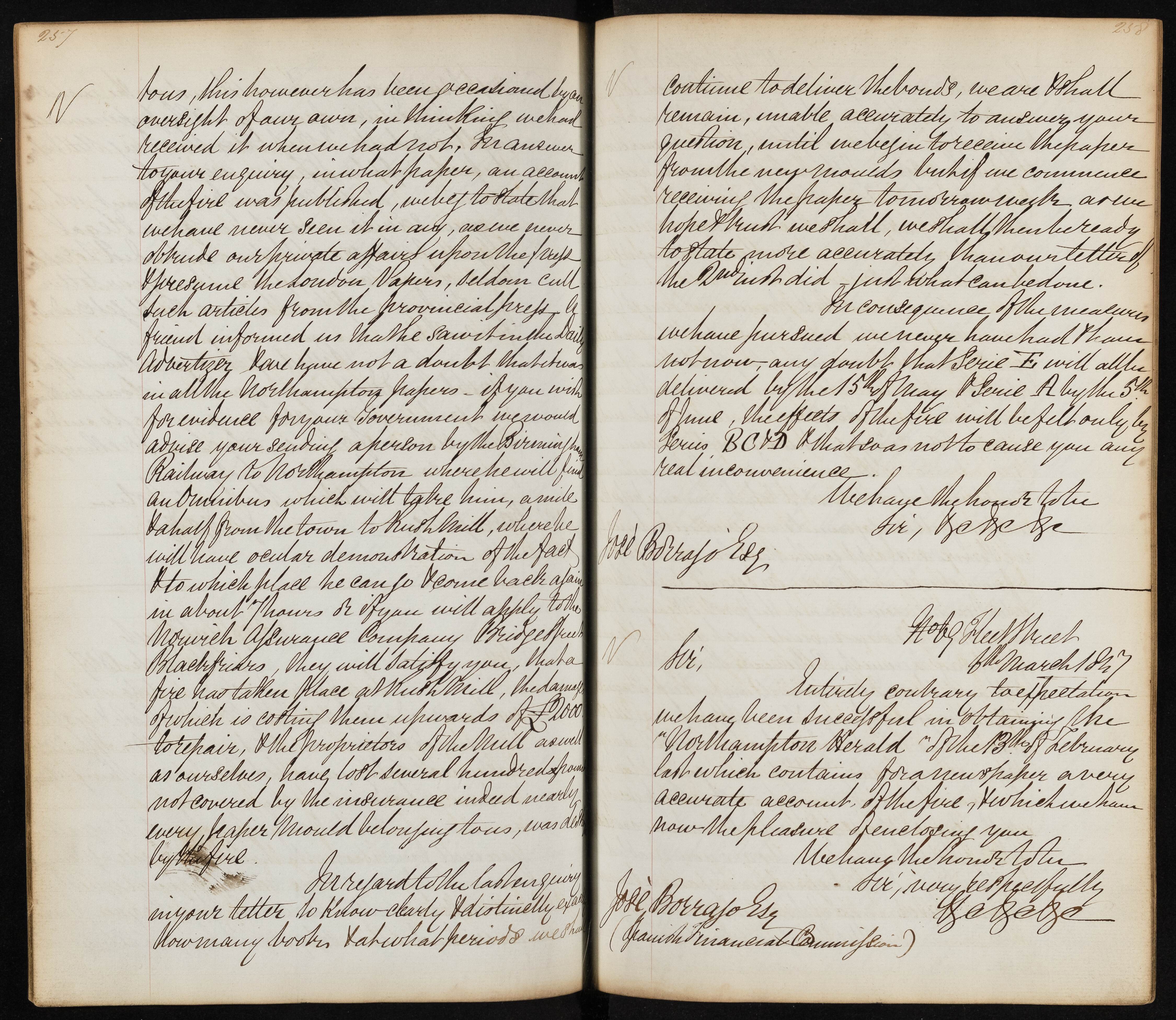 Summary: The sender addresses an enquiry regarding a fire report, stating they have not seen it published in any paper and suggests sending someone to Northampton for evidence. They discuss delays in receiving papers and the impact of the fire on bonds and moulds.