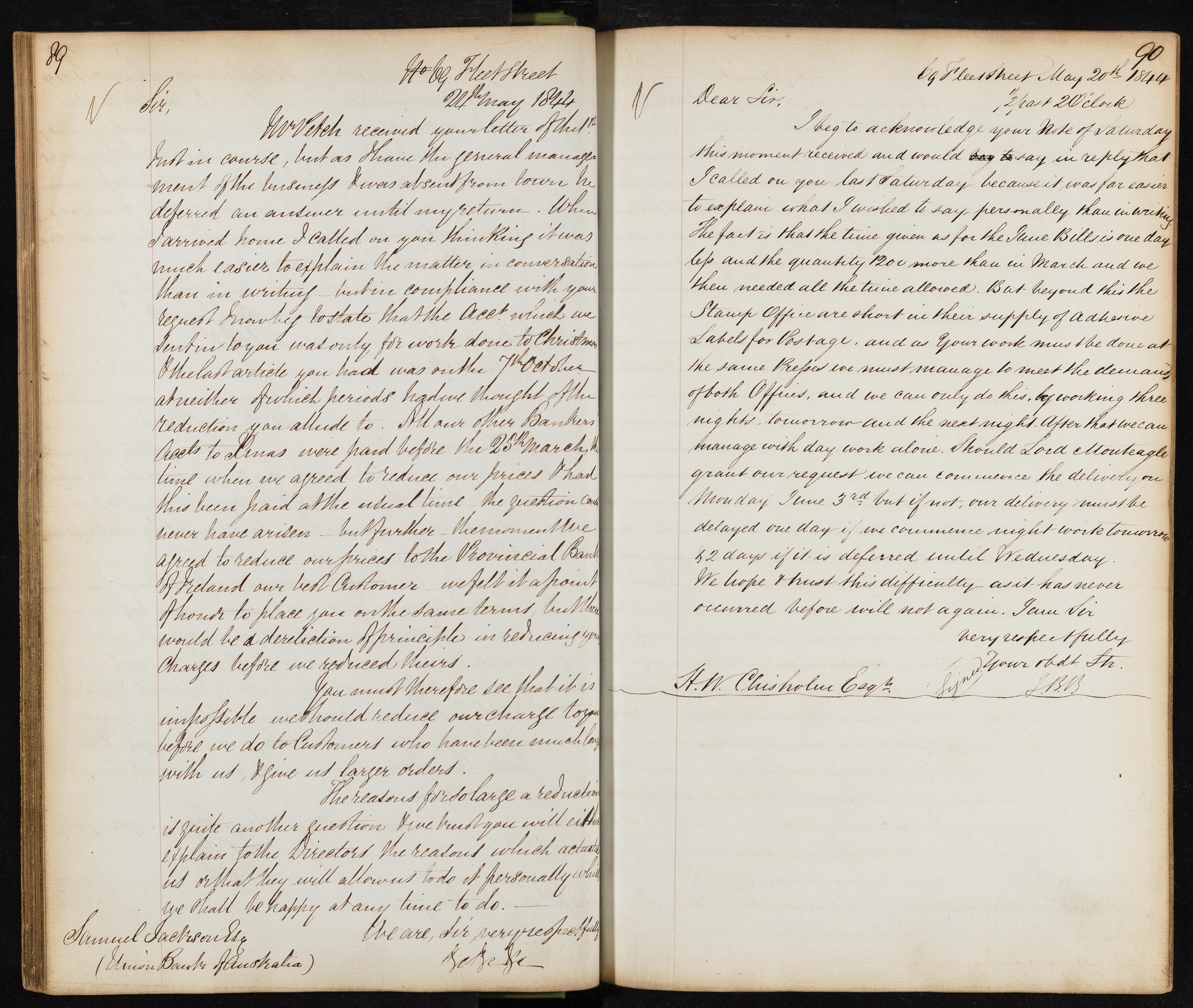Summary: Samuel Jackson Sty explains that the invoice sent was only for work done to a specific article and discusses the reasons for not reducing surcharges before other customers. He emphasizes principles and the need to explain these to the Directors.