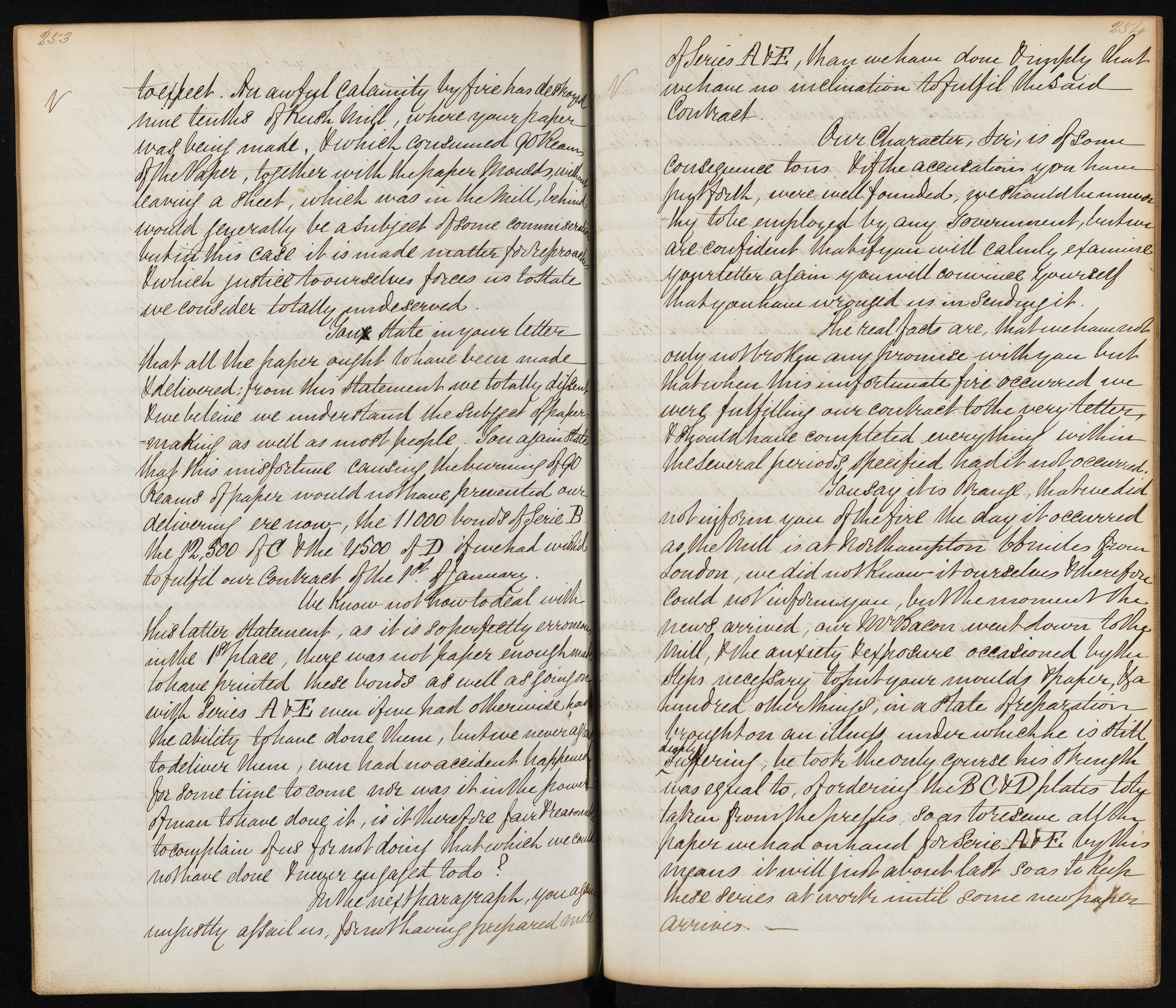 Summary: The sender addresses accusations regarding failure to fulfill a paper contract due to a fire at the mill. They explain the circumstances of the fire, the impact on production, and defend their character and efforts to meet contract terms despite the calamity.
