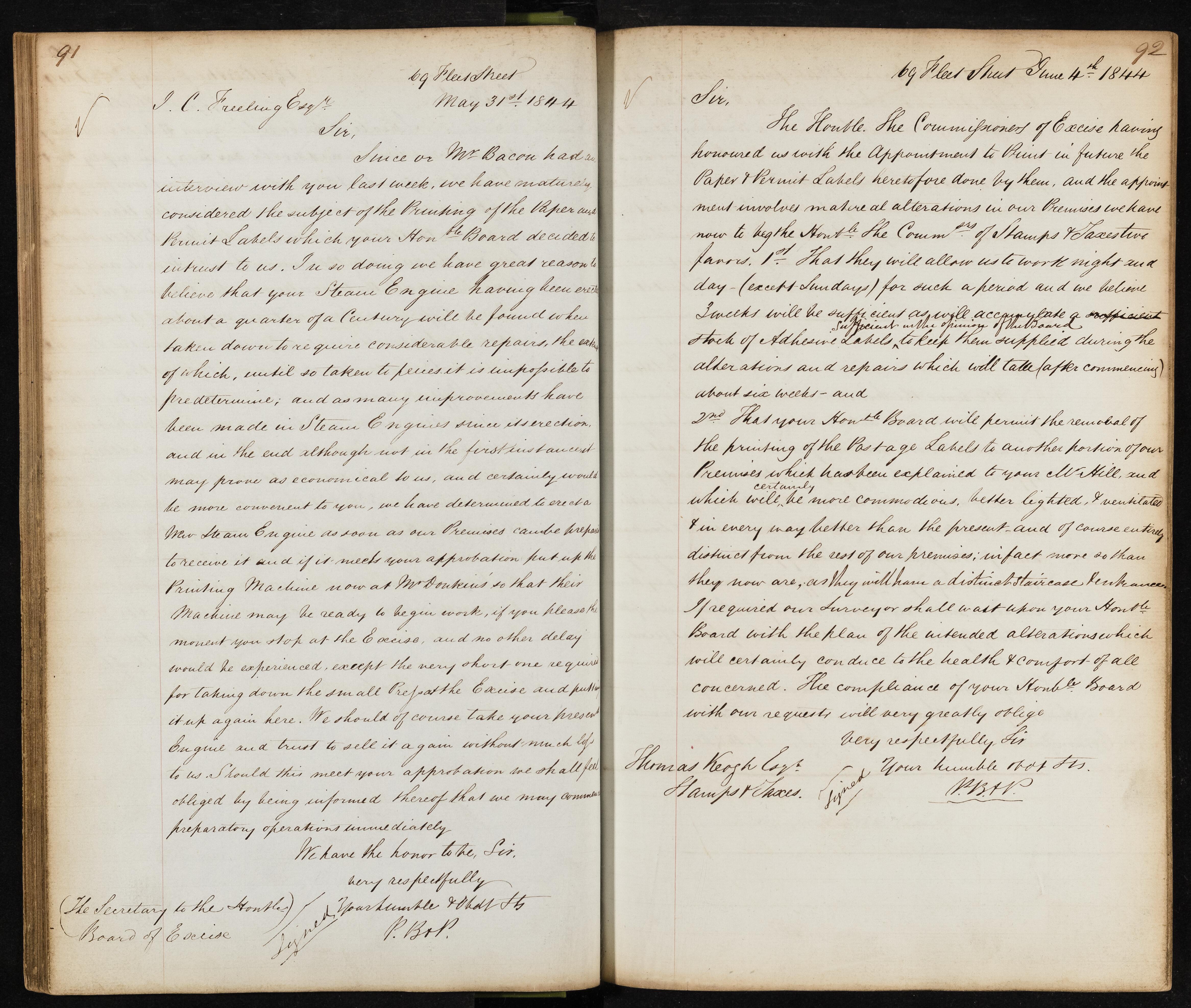 Summary: The letter discusses the condition of a steam engine that has been in use for about 25 years and the decision to erect a new one. It also mentions preparations to install a printing machine and the need for approval to proceed.